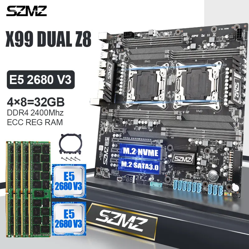 SZMZ X99 Motherboard Set with Dual CPU E5 2680 v3 12 cores 24 Threads and DDR4 4*8GB RAM 2400 MHz NVME M.2 SSD PC Assembly Kit